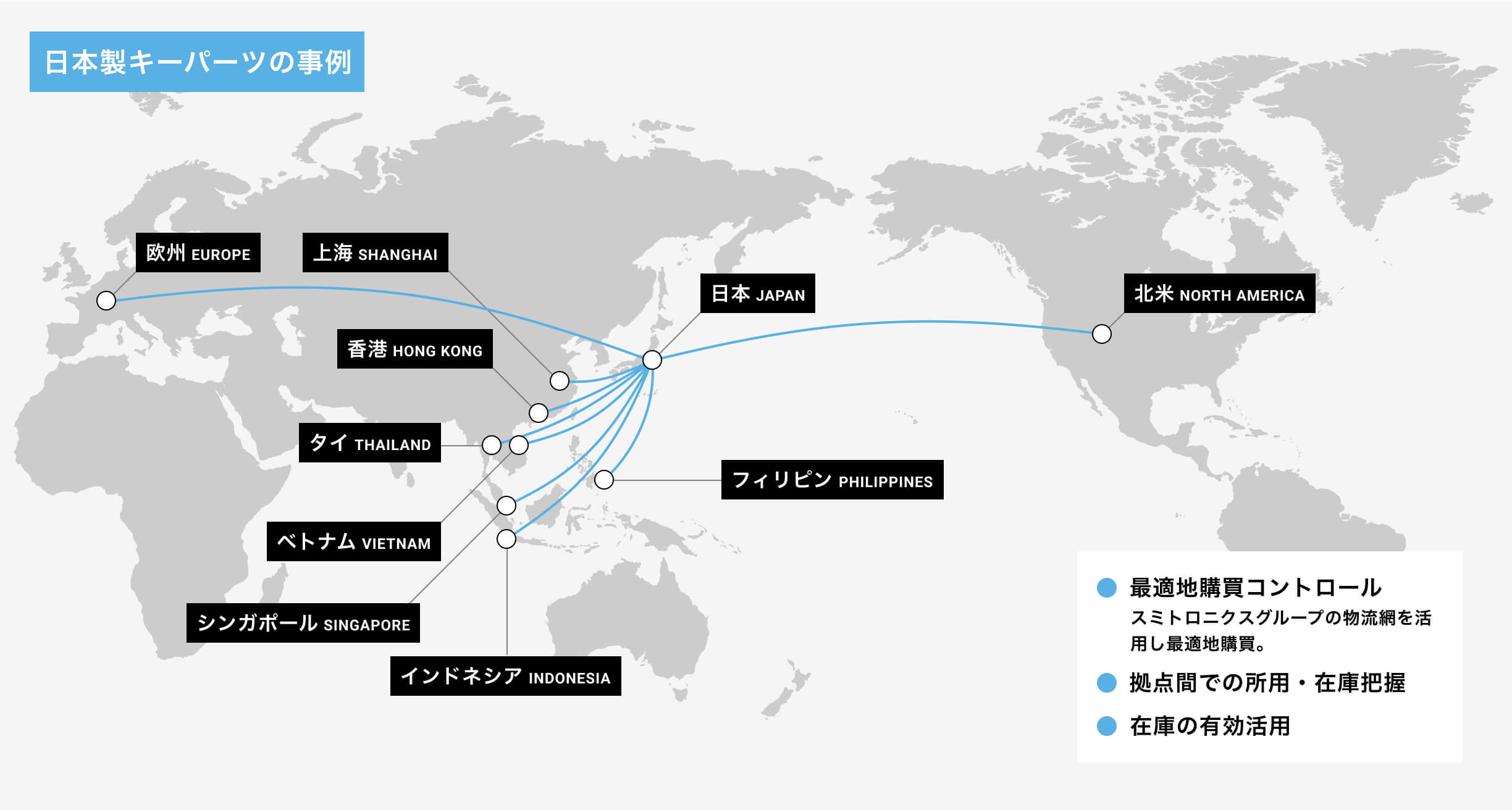 原産地、コスト、リードタイムなどによって各拠点で最適地購買を実現。例えば日本製キーパーツを日本で一括購買し、貨物をまとめて各海外拠点へ供給するため海外調達と比較して、管理費、為替リスク、物流コストをミニマイズすることも可能です。