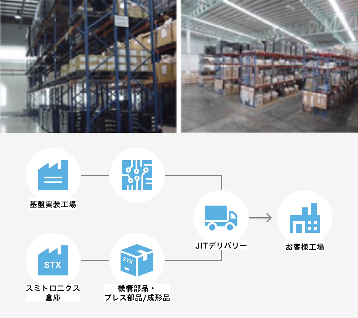 スミトロニクスが各加工委託先の部品調達業務をとりまとめ、集約倉庫で最適な在庫管理を行い、各加工委託先に対し、必要最小限の部品を支給することで、中間在庫の削減を図ります。同時に加工委託先の資金負担も軽減いたします。